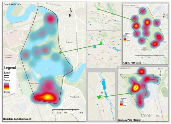 In the studied parks, urban art is dispersed on a large scale (Figure 1), with some density differences discussed in the subsections below.