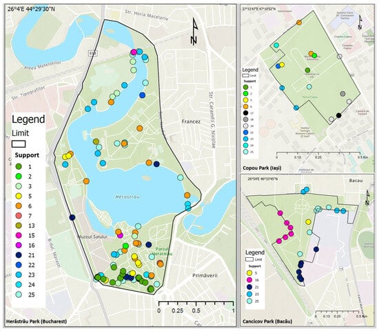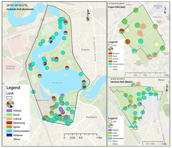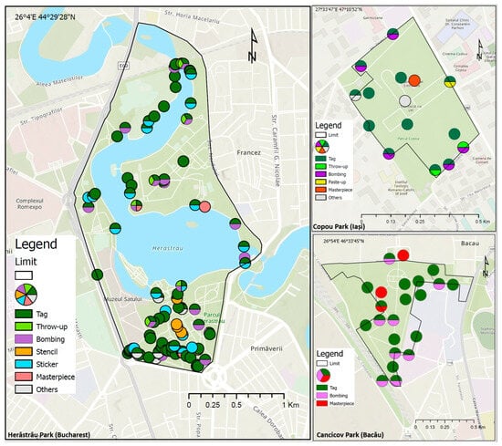 The methodology applied in this study is a complex one and included several stages applied at the level of the three parks: (I) field research for the identification of spots with graffiti and street art and their classification into different categories relying on an international typology in the scientific literature [48] and according to a worksheet used which included the following sections: (A) types of surfaces (supports): benches (1); stairs (2); poles (3); asphalt (4); authorized spaces for garbage collection (5); electricity transformation substations (6); gas substations (7); bicycle racks (8); windows (9); doors (10); shutters (11); fences: residential (12), industrial (13), fences of some restaurants, terraces, bars (14), abandoned fences and other types (15); other types of fences (16); passages (17); bridges (18); walls: residential (19), industrial (20), walls of some restaurants, terraces and bars (21), abandoned walls (22), and other types (23); panels (24); other components (25); (B) location: playgrounds for children; sports places for adults; elderly relaxation places (chess tables, etc.); sports grounds; alleys; other spaces; (C) types of messages: political, economic, social, cultural, communication, advertising, other types; (D) types of urban art: tag; throw up; bombing; graffiti jam; knitting graffiti; paste-up; stencils; stickers; masterpiece; mural; other writing style. (II) Documentation from different informational sources regarding the works identified in the field, an important stage which completes stage A for a correct work’s framing, but also regarding the origin context (on the occasion of an event, economic investments in the area, spontaneous intervention, etc.), year of the work and the author, etc., from publications and mass media, including legislative documents to understand the cities’ policy regarding urban art. (III) Mapping by georeferencing field data and obtaining thematic maps regarding the Kernell density and urban art typologies (by surfaces, messages transmitted, and representations) using ArcGIS Pro 3.1.1. software. (IV) Google Street View to complete information, considering that it is an ephemeral art. Images from the past may be beneficial for comparative analysis that provides information about the phenomenon’s evolution.