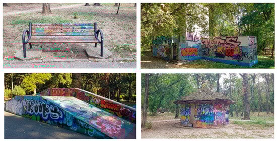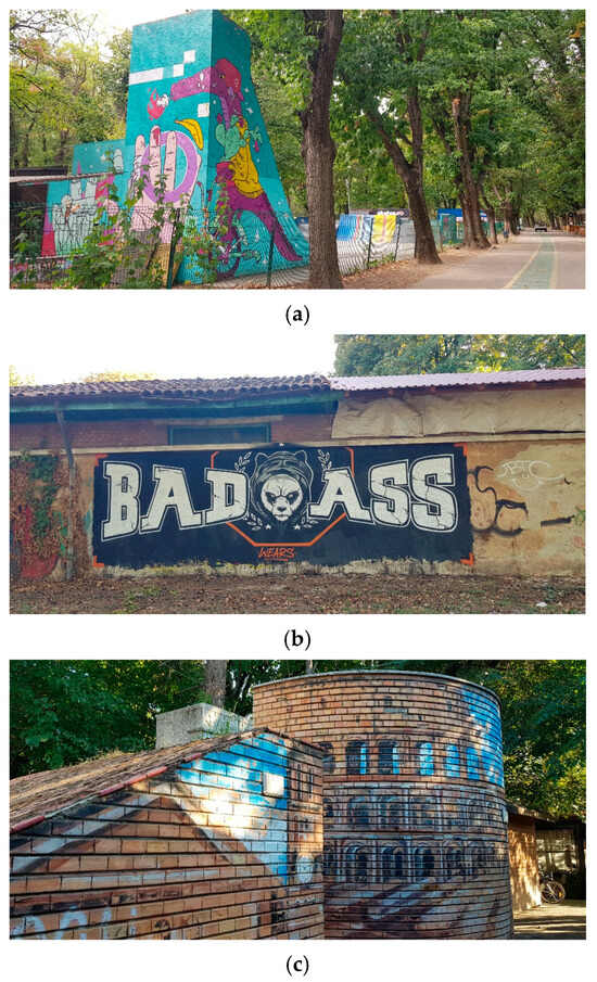 Street art is part of public art, an artistic expression created in streets, squares, and other public spaces, including parks [27]. So, green areas have renowned functional aims: biological, recreational, and, not least, aesthetic [28]. Therefore, to the basic function of parks, urban forests, or other green spaces or areas, namely, relaxation and spending free time, the artistic function is added, often associated with the conservation of the place’s identity, local heritage values, or local social and economic past.