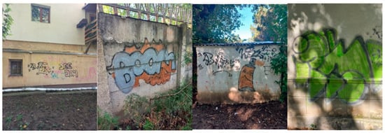 The differentiation between graffiti and street art may be imperceptible [6] and often arbitrary [7] because it is challenging to categorize artworks in all cases despite specific differences that separate the two streams and which are given by [5]: the nature of the intervention (legal versus illegal artworks), types of visual representations, capability in decoding the messages, motivation of intervention, and impact in the landscape, etc. What is certain is that graffiti represents the roots of many forms that are perceptible today in diverse styles, shapes, and templates that have emerged over time [8,9]. However, three categories are recognized and accepted in general. Graffiti, muralism, and art installations are often considered street art [1]. Graffiti may conflict with street art at least from the interventions’ nature point of view, respectively, unauthorized interventions and being associated with vandalism versus legal surfaces [10,11,12].