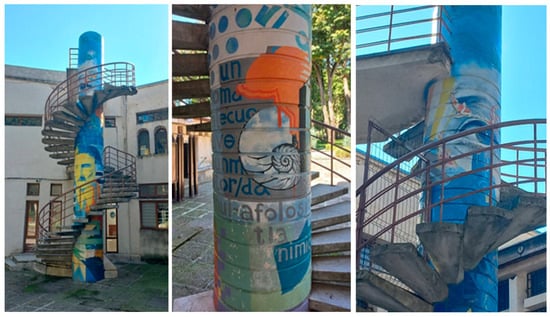 In Copou Park, many works are from tags and bombing styles (Figure 7). Therefore, their aesthetic value is indifferent. Most are mono- or bicolor and most likely belong to the early period of urban art in Iași. The only exception is the mural “Ursachi’s Dream” (Figure 8), an authentic, impressive work, in which the colors yellow, blue, and orange predominate, made with quality materials. In order to emphasize the cultural character of the park, during the rehabilitation works of the urban furniture from 2023, marble book-type benches printed with the most famous poems of the national poet Mihai Eminescu or with fragments from the works of famous prose writers as well as benches covered with reproductions of Romanian painters’ works were installed. These benches have a unique character at the national level and, although they are not included in the urban art category, they are very appreciated by the park’s visitors.
