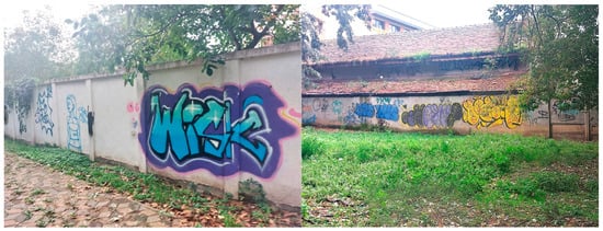 The hosting surfaces of urban art interventions are abundant, including many components of the urban infrastructure: fences, gangways, abandoned buildings, walls, depots, garages, shutters, billboards, fire alarms, benches, posts, cars, trucks, wagons, etc. [6,13,14]. There are studies with different scientific approaches focusing on various geographical areas that analyze the surfaces hosting graffiti and street art works. Some of them are more discussed than others, like the walls [15,16,17], wagons [14], or abandoned industrial buildings [18]. Other studies include narrower research, such as graffiti works on bridges [19] or the impact of graffiti on trees [20].