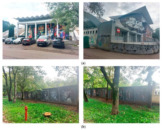 Only three murals were mapped, which explains the statement above regarding a stage of transition towards street art in which graffiti is still predominant (Figure 6). An important mural is in the skate area and the Baraka terrace, which has been operating there since 1998, with colorful performances dedicated to children passionate about movement and skateboarding (Figure 6a). Also, on the wall of a former Kayak–Canoe sports base, an advertisement for a clothing style (BADASS Wears) (Figure 6b) may be observed. However, an authentic work is in the area of a restaurant with Italian cuisine, “Il Calcio”, with representations of the architecture of ancient Rome, including the Colosseum (Figure 6c).