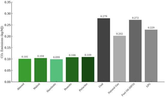 The results show significant differences between fossil fuels and nut residues. On average, the nut residues exhibit specific emissions ranging from 0.099 to 0.109 kg CO2/MJ, with hazelnut as the lowest and pistachio as the highest emitter. In contrast, coal and HFO exceed 0.27 kg CO2/MJ, underscoring the high environmental impact of conventional fossil fuels. Natural gas is the least carbon-intensive fossil fuel (0.202 kg CO2/MJ), yet it is still notably higher than the average emissions of nut-based biomass.