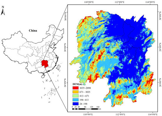 Hunan Province is located in central-southern China (108°47′–114°15′ E, 24°38′–30°08′ N), covering an area of approximately 211,800 km2 (Figure 1). The province is characterized by a complex topography, mainly composed of hills and low mountains, interspersed with basins and plains. It has a subtropical monsoon climate with an annual average temperature of 16–18 °C and precipitation ranging from 1200 to 1700 mm, providing favorable conditions for vegetation growth and biodiversity conservation. Hunan is known for its high forest coverage rate—over 59% in recent years—making it one of China’s most important carbon sink regions.