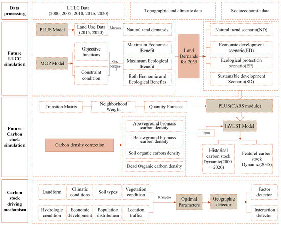 Figure 2 presents the research approach applied in this study. We utilized a multi-model approach, integrating several established geographical and ecological models to achieve our research objectives. By integrating land use with natural and socioeconomic data, the Multi-Objective Optimization Problem (MOP) [42] and Patch-generating Land Use Simulation (PLUS) model [30] simulated land use in 2035 across different development scenarios. Using the InVEST model [43,44], the carbon stock of Hunan Province was evaluated and predicted under various scenarios from 2000 to 2020 and in 2035.