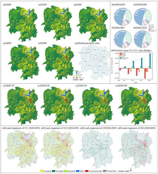 The resulting optimal area targets for each land use type from the MOP model under these scenarios were then used as quantitative constraints for the PLUS model’s spatial allocation, ensuring that the simulated LULC patterns reflect these macro-level socioeconomic and ecological objectives [45].