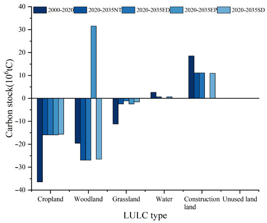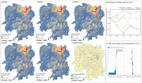 Climate change issues have become increasingly prominent, including global warming and ecosystem function degradation [1]. Meanwhile, carbon stock refers to the balance between carbon dioxide the ecosystem’s uptake, and emissions into the atmosphere, with a vital role in the global carbon cycle and climate regulation [2,3]. Increasing the carbon stocks within terrestrial ecosystems has attracted the attention of governments and researchers globally. Land use/land cover (LULC) changes critically impact carbon stock and land use structure, function, and processes [4] in terrestrial ecosystems [5,6,7,8] and the overall global carbon balance [9,10,11]. Therefore, conducting regional multi-scenario carbon stock predictions and analyzing the factors influencing land use are significant for promoting low-carbon development in regional socioeconomic systems, optimizing land use structure, and contributing to climate change mitigation [12,13].