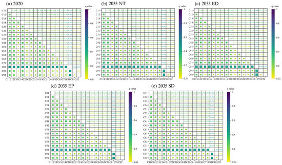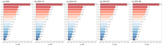 A SC value of less than 1 indicates that the total carbon stock estimation is inelastic to changes in that specific land use type’s carbon density. A smaller SC value implies that the accuracy of the carbon density coefficient for that land use type has a weaker influence on the overall total carbon stock assessment, suggesting the chosen carbon density value is more reasonable or that the total carbon stock is less sensitive to variations in that specific type. Conversely, an SC value greater than 1 would indicate a higher sensitivity, where a small change in the input carbon density leads to a proportionally larger change in the total carbon stock.