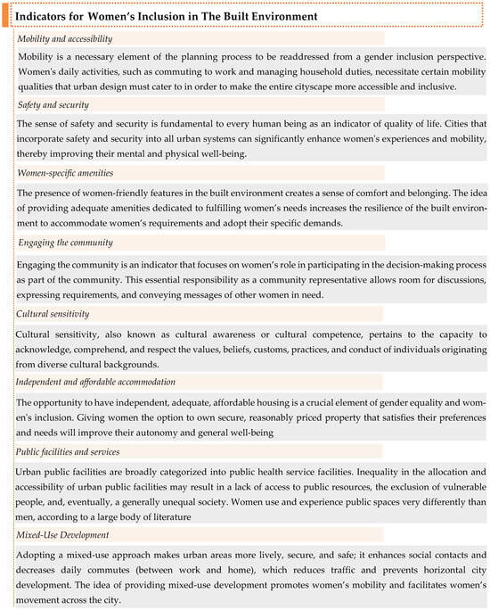 The study has tackled a group of indicators which can be used to alter how cities are designed and structured, making them more friendly and inclusive to women’s requirements. Two of these indicators are related to the following: first, access and mobility; second, safety and security []. The research adds new perspectives to the ongoing discussion on women’s inclusion in the built environment, by drawing on the actual research conducted with varied groups of women and desk-based literature reviews. It outlines six more indicators that affect women’s inclusion and impact city planning, those related to cultural sensitivity, public facilities and services, community engagement, mixed-use development, gender-specific amenities, and affordable housing options.