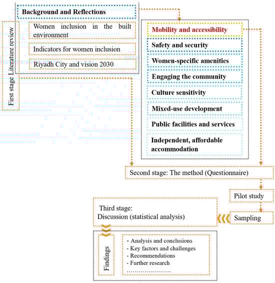 The methodology was structured in sequential stages (as shown in Figure 2). Firstly, it begins with a comprehensive literature review regarding women inclusion in the built environment, in the view of the Vision 2030. The literature introduces eight indicators, defining the inclusiveness of women. The research oriented its focus to study women’s mobility behavior as a tool for indicating women inclusion. Nevertheless, women mobility has been appealing as a measurable indicator since 2018 by the initiation of the royal decree to allow women to drive. And the 2030 vision that encourage women empowerment with more engagement in the business market and other platforms that acquire resilient city mobility. In addition to the large public transportation project currently underway in Riyadh, these changes motivate community members, especially women, to utilize buses and metro lines for their daily trips.
