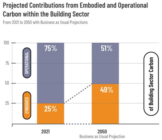 Anticipated shifts in carbon emissions (embodied and operational) from 2021 to 2050; source: [5].