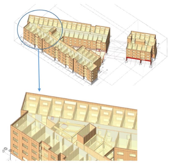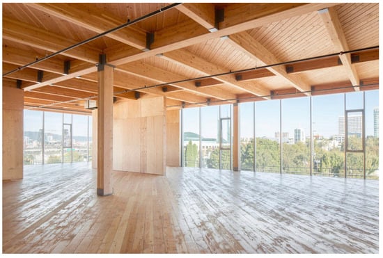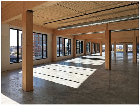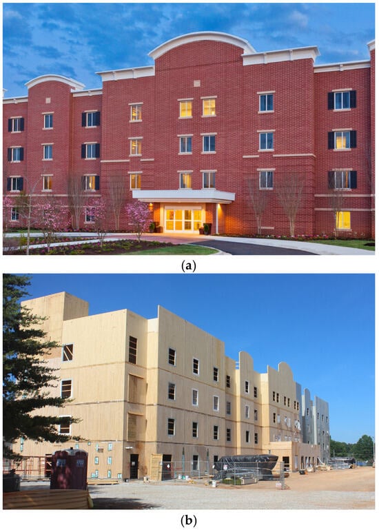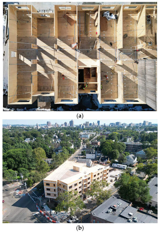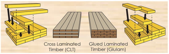 Mass timber (Figure 2) refers to a category of framing styles often using small wood members formed into large panelized solid wood construction, including CLT, Nail Laminated Timber (NLT), Dowel Laminated Timber (DLT), or glulam panels for floor, roof, and wall framing [10]. The most well-known example is CLT [11]. Mass timber is increasingly used in building applications [12] as people begin to recognize and take advantage of its benefits [8,13,14].