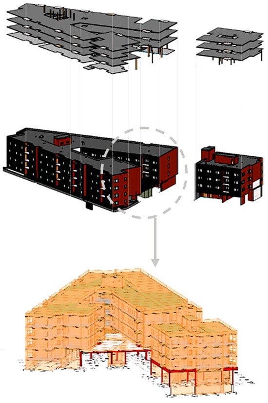 The study on 340+ Dixwell’s embodied carbon emissions footprint employs embodied carbon emissions calculations using One Click LCA (2015)® software (Version 0.40.0) [36], which primarily relies on its default database in conjunction with well-known databases such as Eco Invent, GaBi, and the USLCI database. The assessment concentrated on building elements such as the substructure, superstructure, and enclosure (Figure 13) and covered both lifecycle stages A1–A3 and A1–A5 (as shown in Figure 14). The key materials evaluated included timber, concrete, metals, glass, and insulation, as specified in the project construction documents provided by the 340+ Dixwell design team. The functional unit chosen for the study was 1 m2 of the building area.