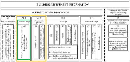 Building life cycle stages and their information modules for construction products and construction works—ISO 21931; The yellow and green outlines indicate the stages that are covered in this study.