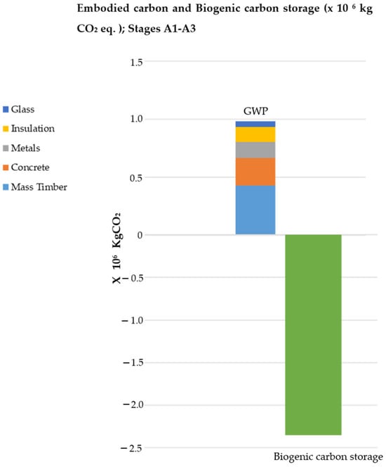 Table 1 shows that the total embodied carbon emissions for stages A1 to A5 amount to 1,171,000 kg CO2 eq. (or 157.8 kg CO2 eq./m2), while the total biogenic carbon storage is 2,350,000 kg CO2 eq. (or −316.8 kg CO2 eq./m2). Breaking it down, the embodied carbon emissions for the product stage (A1 to A3) are 982,000 kg CO2 eq. (or 132.5 kg CO2 eq./m2), for transportation to the building site (A4) is 81,000 kg CO2 eq., and for the construction/installation process (A5) is 107,000 kg CO2 eq.