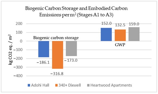 Figure 18 shows the comparison between the GWP and biogenic carbon storage of the 340+ Dixwell project, Adohi Hall, and Heartwood. The graph demonstrates that Adohi Hall’s contribution to carbon emissions during the product stage (A1–A3) is 152.0 kg CO2 eq./m2 of the floor area [28], while the 340+ Dixwell project exhibited lower emissions at 132.5 kg CO2 eq./m2. The University of Washington’s life cycle assessment (LCA) for Heartwood revealed that the global warming potential (GWP) for the A1–A3 stages was 159 kg CO2 eq./m2 [27]. This GWP is higher than that of both 340+ Dixwell (132.5 kg CO2 eq./m2) and Adohi Hall (152 kg CO2 eq./m2), with 340+ Dixwell having the lowest GWP among them.