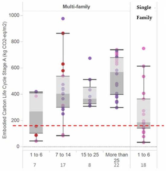The CLF Embodied Carbon Benchmark Study [37] reported that the initial embodied carbon (LCA Stage A) associated with a building’s structure, foundation, and enclosure is generally below 1000 kg CO2 eq./m2. For low-rise residential buildings (fewer than seven stories), the initial embodied carbon (LCA Stage A) of the structure, foundation, and enclosure is typically below 500 kg CO2 eq./m2.