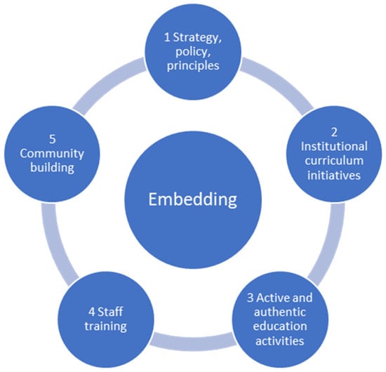 This paper has presented a conceptual framework for supporting embedding in the curriculum which is operationalised across five strategic areas: 1. strategy, policy, and principles; 2. institution-wide curriculum change; 3. active and authentic educational activities; 4. staff development; and 5. community building. Across these five areas, we argue that a strategic approach is necessary for successful and impactful embedding of sustainability in the curriculum. Work across each domain needs to be closely aligned and interconnected, and to build links with existing policy, strategy, and frameworks. Our approach is anchored in key themes: co-creation, authentic learning, community building, programme design fundamentals, and graduate attributes. The power in our approach lies in its focus on participatory practice, meaningful student engagement, and a multidisciplinary perspective.