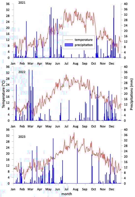 Meteorological conditions, including daily air temperature and precipitation, for the years 2021, 2022, and 2023.