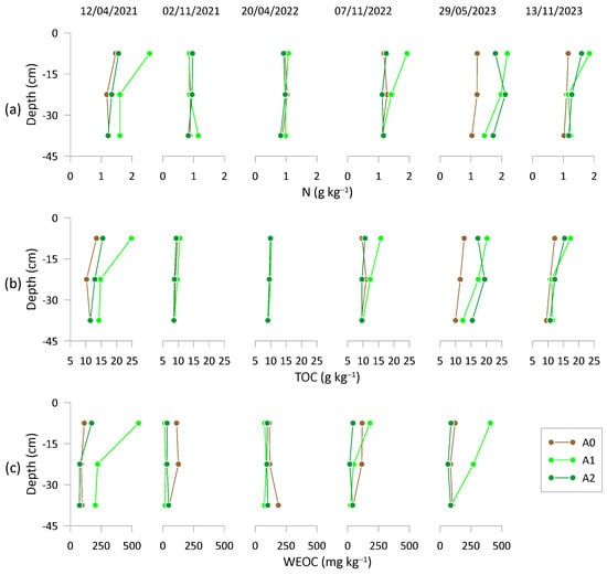 (a) Nitrogen (N), (b) total organic content (TOC) and (c) water-extractable organic carbon (WEOC) content at three depts (0–15 cm; 15–30 cm; 30–45 cm) across the three treatments: A0 = control; A1 = full dosage of soil amendment; A2 = half dosage of soil amendment. The sampling dates are reported at the top of the Figure (dd/mm/yyyy).