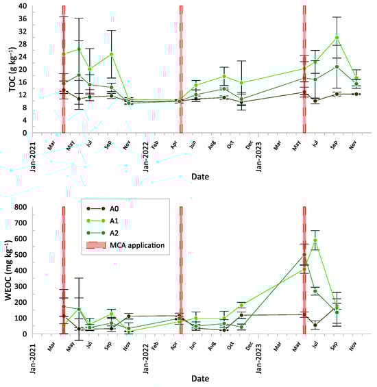 The time evolution of TOC and WEOC in the surface layer (0–15 cm) is reported in Figure 3, with TOC in the upper panel and WEOC in the bottom panel. MCA application dates are also indicated for each season. The TOC content in A1 was significantly higher than in A2 and A0. The TOC pattern for A2 displayed intermediate values between A1 and the control A0, with both treatments showing constant and similar patterns. In all three seasons, TOC trends in A1 and A2 followed a similar pattern, increasing from the day of application and peaking several weeks later. Notably, during the first season, the effect of MCA diminished after the summer, while in the second year, the effect remained pronounced. In particular, the TOC level in A0 remained nearly constant throughout the seasons (11.4 ± 1.3, 10.3 ± 0.7, 11.8 ± 1.2 g kg−1, for 2021, 2022, 2023, respectively), while in the treatments with MCA, it exhibited a bell-shaped trend, with increases during the warmer months followed by a decrease towards A0 levels in early autumn. Starting from the second season, TOC levels in both A1 (21.3 ± 6.5, 14.7 ± 3.2, 22.5 ± 5.4 g kg−1) and A2 (14.5 ± 3.2, 11.7 ± 1.7, 17.6 ± 2.3 g kg−1) remained above A0.