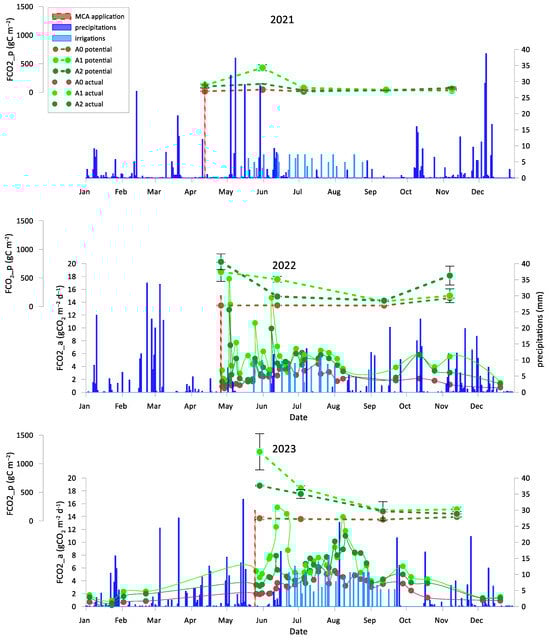 Figure 4 illustrates the patterns of cumulative FCO2_p, along with MCA application dates, precipitations, and irrigation events. Over the years, an increase in FCO2_p was observed in the amended treatments, while the control A0 showed almost constant values. The maximum values for the amended treatments (A1, A2) were recorded in June of the first year, several weeks after the MCA application. In contrast, during the second and third years, peaks were reached on the first sampling day following the application. In the first year, the MCA effect diminished rapidly after June, when potential respiration followed a plateau with values close to zero until the next MCA application. Across the three years, the minimum FCO2_p values for A1 and A2 were recorded in September. Conversely, the control (A0) shows substantially low constant values of potential CO2 fluxes throughout all years, with the highest cumulative C value registered in November, except for 2021, when the peak occurred in September.