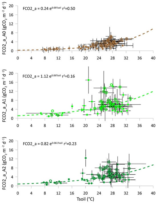 Relationships between the actual CO2 fluxes (FCO2_a) and soil temperature (Tsoil) for the three treatments: full symbols represent 2022, and empty symbols represent 2023. A0 = control; A1 = full dosage of soil amendment; A2 = half dosage of soil amendment.