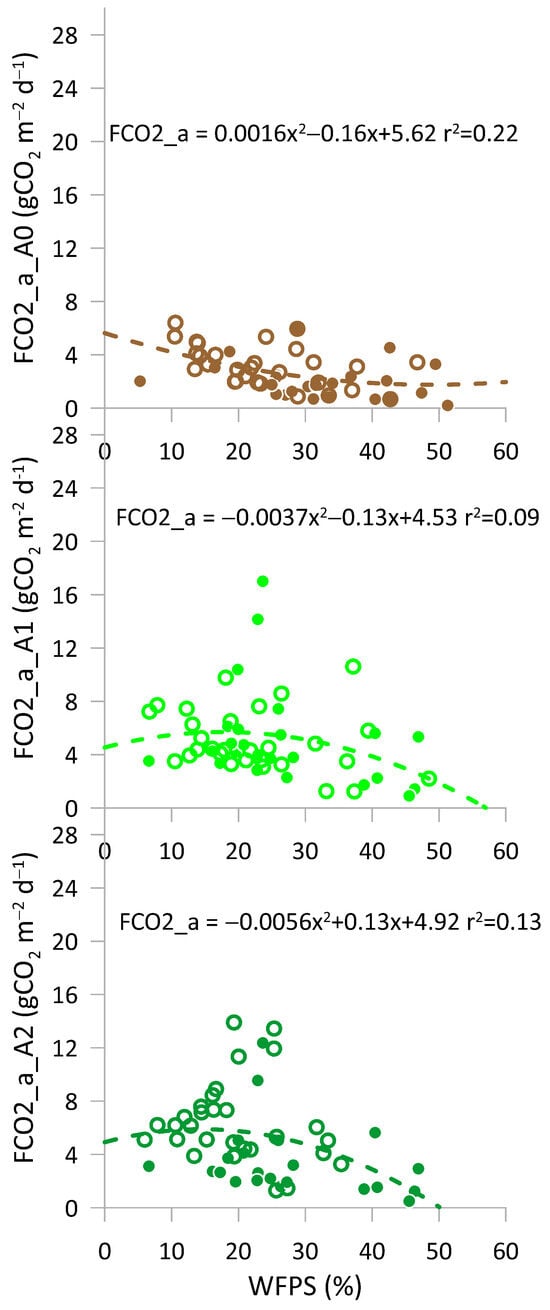 Relationships between the actual CO2 fluxes (FCO2_a) and WFPS for the three treatments: full symbols represent 2022, and empty symbols represent 2023. A0 = control; A1 = full dosage of soil amendment; A2 = half dosage of soil amendment.