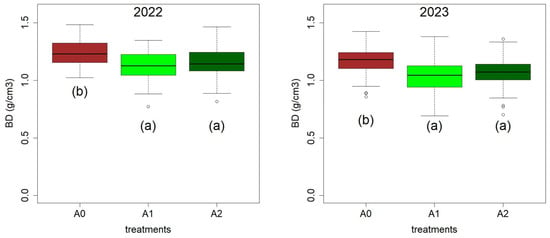 Bulk density (BD) during 2022 and 2023 for the three treatments: A0 = control; A1 = full dosage of soil amendment; A2 = half dosage of soil amendment. Different letters indicate a significant difference (p-value < 0.05).