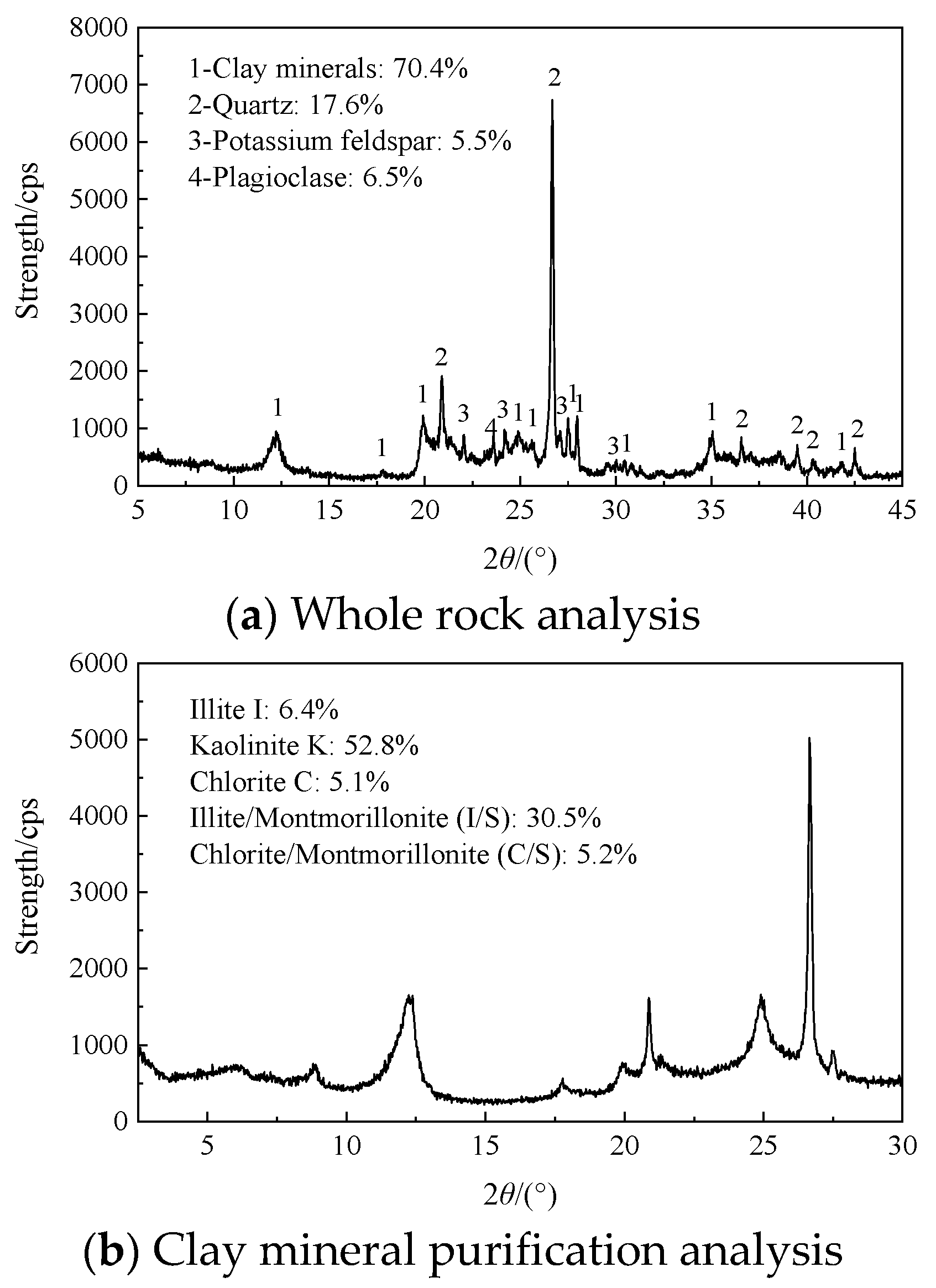 | Samples | Quartz/% | Potassium Feldspar/% | Plagioclase/% | Clay Minerals/% | Components of Clay Minerals/% | ||||
