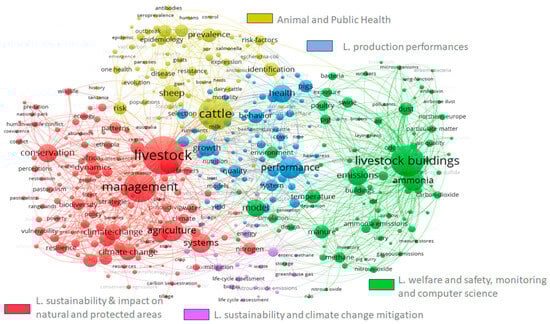 Figure 2. The VOSviewer map based on the WoS search (livestock building) resulting in 7944 total records. L. is the abbreviation of livestock. The colours in the legend represent the main research areas associated with the corresponding keyword clusters.