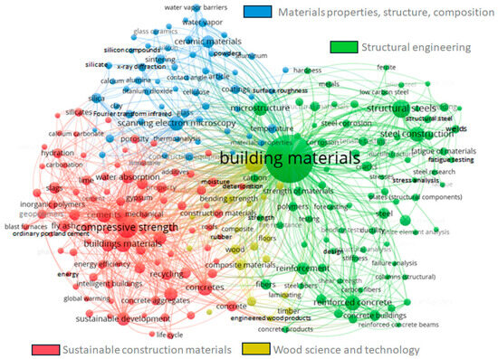 The data analysis performed using “building materials” as a Kw on Scopus led to over 69,000 records. The keyword analysis results led to a visual description of the major research fields and their connections (Figure 3).