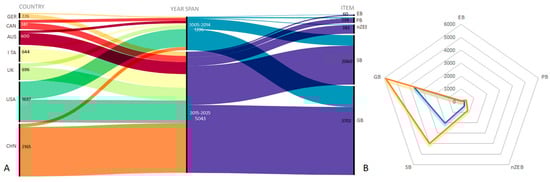 Figure 5. Research items within the last two decades based on Scopus search (limited to title, abstract, and keywords). (A) The research flux of the most active countries in producing research articles, namely Germany (GER), Canada (CAN), Australia (AUS), Italy (ITA), United Kingdom (UK), United States of America (USA), and China (CHN). The items on which the research was focused are environmental building (EB), passive building (PB), nearly zero-energy building (nZEB), sustainable building (SB), and green building (GB). (B) Total scientific production (orange area) with respect to the most active countries in the field (blue).