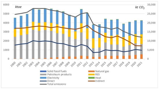 Final energy consumption and direct (Scope 1) and indirect (Scope 2) CO2 emissions from the Greek residential sector during the period 2000–2021 (kt). Source: Eurostat [env_air_gge] [nrg_bal_s] and own calculations.