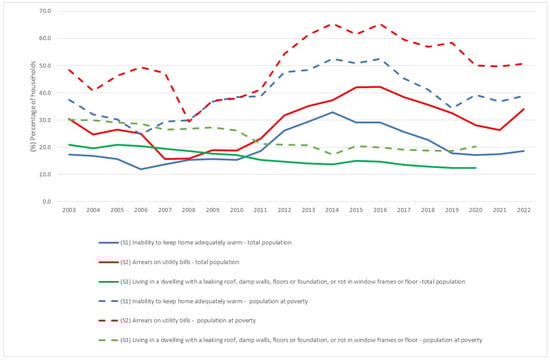 To a large extent, the significant improvement in the carbon footprint of the Greek residential sector during the period 2000–2021 and particularly after 2012 came from forced behavioral changes due to the increase in fuel costs (e.g., the gradual phasing out of heating oil), as well as from the decarbonization of the power generation sector. The former is strongly related to the dramatic deterioration in energy poverty indicators observed during this period, as energy prices increased and the available income of households decreased. Figure 2 presents the evolution of energy poverty in Greece during the last 20 years (2003–2022) based on the three subjective indicators from the EU-SILC survey, namely the (i) inability to keep homes adequately warm (S1), (ii) arrears on utility bills (S2), and (iii) dwellings with leaking roof; damp walls, floors, or foundation; or rot in window frames or floor (S3). The analysis of these indicators shows that energy poverty is significantly more pronounced among lower-income households. The fluctuations in indicators S1 and S2 during the period 2010–2021 indicate that the very high energy poverty rates (above 25%) observed during this period were largely driven by the economic crisis, and the associated reductions in household income (the average income of households declined by more than 35% due to the austerity policies implemented [47]) and rising energy prices were due to new taxes imposed [37] during the period 2010–2017. Moreover, 15% of households live in houses with significant structural issues, indicating that energy poverty in these cases is likely to be more deeply rooted in structural conditions. Energy-saving interventions promoted during the same period were limited and yielded much lower energy savings, leaving a significant percentage of the Greek households without adequate heating for their homes and with delays in utility bill payments.