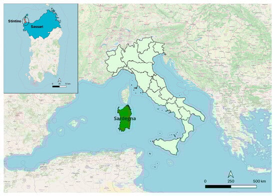 Geographical location of Stintino in Sardinia (Italy, Europe). The inset provides an enlarged view of Sardinia, with a focus on the Stintino territory in the Province of Sassari. (Authors’ elaboration).