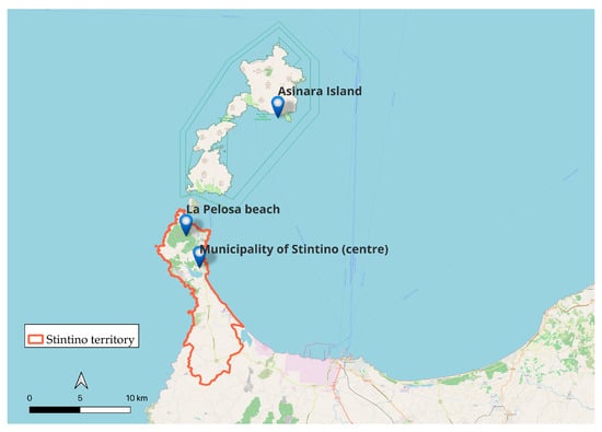 The territory of Stintino, with the geolocation of its center and La Pelosa beach. Asinara Island (in the province of Porto Torres) is highlighted as well. (Authors’ elaboration).
