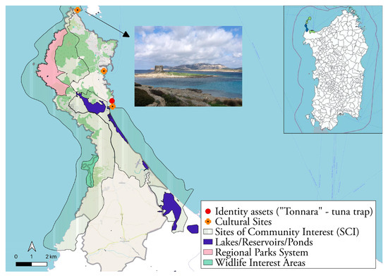 Stintino hosts areas included in the Natura 2000 Ecological Network, established under Directive 92/43/EEC. Natura 2000 defines Sites of Community Importance (SCIs), which are locations identified by Member States as essential for the protection of natural habitats and species of flora and fauna that are rare or under threat; it also recognizes Special Areas of Conservation (SACs) and Special Protection Areas (SPAs). Stintino includes Stagno di Pilo e di Casaraccio and the Complex of Coasts and Islets of the Northwestern Side SCIs. Additionally, the SPA comprising Stagno di Pilo Casaraccio and Saline di Stintino represents the most important wetland in northwestern Sardinia, hosting breeding birds such as the purple heron (Ardea purpurea) and the little bittern (Ixobrychus minutus), along with flamingos and migratory ducks during the winter season. The stagnant water zones are connected by a coastal strip featuring salt pans and dunes, which support halophytic and psammophilous vegetation [76]. Cultural heritage sites also hold a pivotal regional significance. Among these, the Tonnara (i.e., tuna trap) Saline was categorized as an identity asset in the 2006 Regional Landscape Plan, while the Tonnara Museum (MuT), founded in 2016, represents the historical interplay between Asinara and Stintino. Asinara Island itself is connected to Stintino history. In the 18th century, it became an area of attraction for both Sardinian pastoral activities and Ligurian fishing, primarily focused on coral and tuna. Then, it was designated as a penal colony and quarantine station. This forced evacuation of the island led to the founding of Isthintini (“intestine”), the original name of Stintino, referring to the narrow strip of land where the exiles settled in the 19th century. A fishing village was founded near the Tonnara Saline, which, in the first half of the 20th century, began to host summer visitors; among these were Sassari residents who rented the fishermen’s houses. Despite the emergence of mass tourism during the economically prosperous 1960s, the town’s identity as a fishing hub remained central [77]. Today, the MuT, the Regata della Vela Latina, and various maritime-themed festivals mark Stintino as a true cultural center in the Mediterranean.