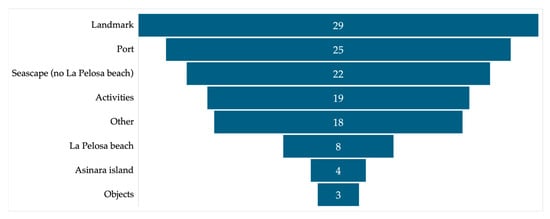 The participants submitted a total of 145 photographs. Following a data refinement process (discarding blurred or excessively dark images and photographs with unidentifiable objects), a total of 128 photographs were finally considered and analyzed. The pictures were then systematically categorized by two different researchers (Figure 4). It was immediately evident that participants primarily selected photographs highlighting identifying aspects of Stintino’s coastal reality while largely disregarding the most tourist-frequented locations and the Objects category. This suggested that participants would not prioritize such elements when narrating or representing their sense of place, even in the case of tourism promotion.