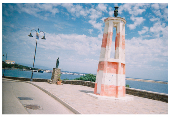 Overall, in this study, the data suggested a strong local relationship with the port environment (a recurrent subject in the photographs) and, consequently, fishing-related activities. Consequently, landmark and port categories were strongly connected. An example was the landmark represented by an old lighthouse (Figure 5; six photos), which, according to local testimonies, was built between the 1940s and 1950s to signal the Port Mannu for fishermen during the night, since electricity was not yet available in the village. At the top of the structure, a flame (likely acetylene-based) was maintained within a protective glass enclosure. The lighthouse was, and still is, equipped with a door and an internal staircase.