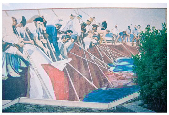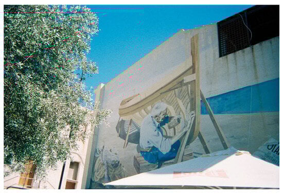Another emblematic landmark was a mural depicting a man working near a small boat (Figure 6; one photo). Residents immediately identified it as a tribute to a master shipwright from Stintino, whose craft was dedicated to the construction and refinement of the traditional gozzi boats used by local fishermen [111]. Specifically, the tribute is dedicated to Giuseppe Benenati, affectionately remembered by the local community as Zio Peppe, the last master shipwright of the town (who passed away on 12 September 2000, at the age of 94) [112,113]. The placement of the artwork was not a casual choice: the master shipwright often worked in the area directly below the mural, where a small beaten-earth workspace once stood.