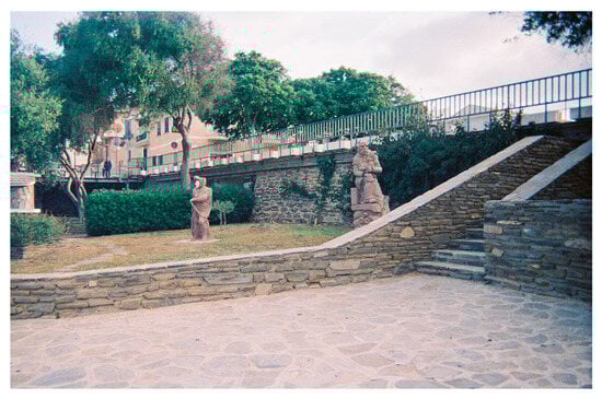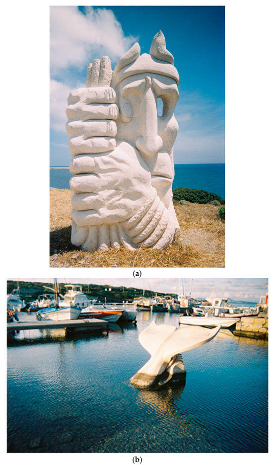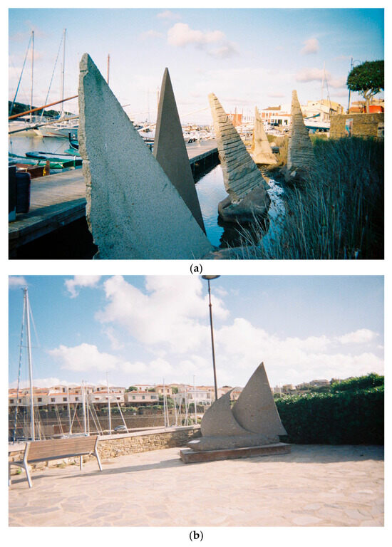 The sculptures are tributes to the tradition of vela latina sailing as well (Figure 10; six photos). This sailing technique, passed down for centuries, has become a symbol of Stintino to which the previously mentioned Regata della Vela Latina is dedicated [114].