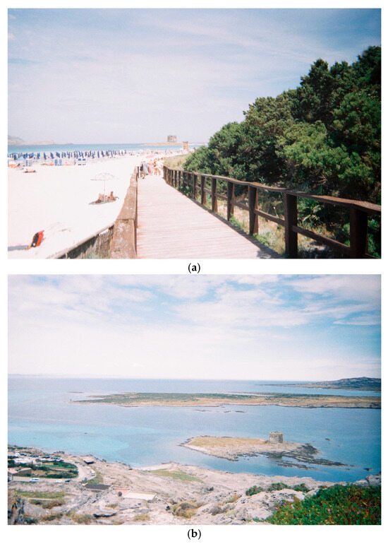 The village of Le Saline, now oriented toward tourism, once housed facilities for tuna processing, lodgings for tonnarotti (i.e., tuna fishers), and storage areas for the Rais (i.e., the Tonnara’s master). This deep connection to Tonnara activities is a clear example of Genius Loci [78]. Another significant cultural landmark is La Pelosa Tower, located on a small islet off the coast of the beach, at the tip of the Capo Falcone promontory. The structure was specifically built to protect the area between Capo Falcone and Asinara, and it was abandoned in the 20th century, though partial conservation and restoration efforts to mitigate erosion have been underway since 2009 [79]. Although not accessible to visitors, the tower remains a popular tourist attraction due to its prominent location across from the crowded beach. It frequently serves as the subject of captivating photographic reproductions, not as a recognized example of Sardinia’s unique historical heritage, but rather as an esthetically striking backdrop to La Pelosa beach.