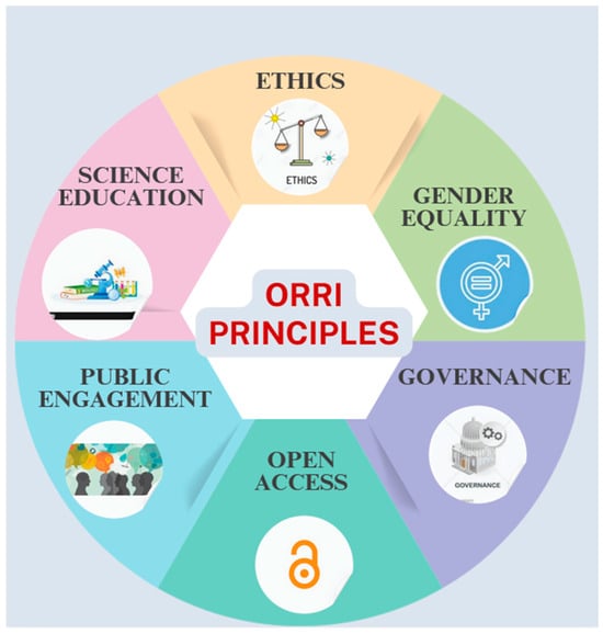 The six key principles that underpin ORRI (Figure 1) are designed to support innovation that is not only scientifically rigorous but also socially responsible and aligned with broader societal values [4,8]. Public engagement facilitates the inclusion of diverse stakeholder perspectives, ensuring that research outcomes address societal needs. Open access promotes the dissemination of research findings, enhancing transparency and empowering collaborative knowledge sharing. Gender equality ensures diverse representation within research teams, enhancing creativity and inclusivity. Science education cultivates a scientifically literate public, empowering informed decision-making. Ethics upholds the integrity of research by adhering to moral standards, and governance structures ensure transparency, accountability, and alignment with societal priorities. Collectively, these principles aim to support innovation that is both scientifically sound and socially beneficial.