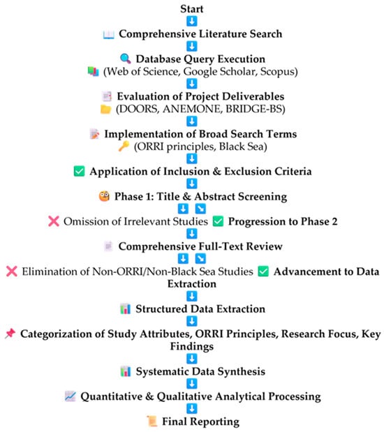 The inclusion criteria for this review were designed to ensure relevance to ORRI and marine research in the Black Sea. Only peer-reviewed articles, project reports, and conference proceedings published between 2014 and 2024 were considered, capturing recent developments. The review focuses on the period 2014–2024 to align with the timeframe in which ORRI became explicitly integrated into European research and innovation policy. While the broader concept of Responsible Research and Innovation (RRI) began gaining traction around 2012 through Horizon 2020, ORRI—as an operational framework emphasizing openness, inclusivity, and sustainability—was concretely adopted in EU-funded marine and environmental research projects starting in the mid-2010s. Consequently, the selected time window ensures that the studies and project deliverables reflect the formal implementation of ORRI principles in marine science, particularly in the Black Sea context. Earlier initiatives prior to this period were not included, as they typically did not use ORRI terminology or framework alignment in a systematic or policy-driven way.