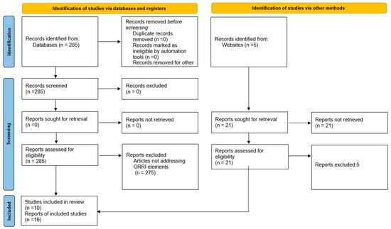 The systematic review process involved the identification, screening, and inclusion of relevant studies, as illustrated in Figure 4. A total of 285 records were retrieved from scientific databases. Additionally, five records were identified through other sources, specifically from project websites, which contributed further insights into the implementation of ORRI in the region. After applying the inclusion and exclusion criteria, 285 records from databases underwent screening. This process led to the exclusion of 275 records due to a lack of relevance to ORRI. Following a detailed eligibility assessment, 10 scientific papers from the databases were included in the final review. The 5 additional records identified via other methods (websites) resulted in 21 reports being assessed for eligibility. Of these, 16 reports, corresponding to projects reports and deliverables, were included in the review (Figure 4).