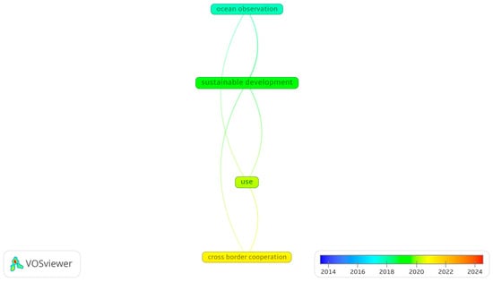 The VOSviewer 1.6.20 analysis, based on data from the four key research papers reviewed, identified frequently co-occurring terms related to ORRI implementation in marine research. As illustrated in Figure 5, the most prominent themes were ocean observation, sustainable development, use, and cross-border cooperation. While the limited number of input studies naturally restricts the breadth of the visualization, the network still reveals some meaningful patterns. Earlier publications (visualized in blue-green tones) emphasized ocean observation, reflecting a focus on monitoring and data collection technologies. The green-shaded cluster around sustainable development indicates that this theme has been consistently present throughout the timeline. More recent works (highlighted in yellow) emphasize cross-border cooperation, underscoring a growing focus on transnational collaboration. The term use appeared centrally in the network, indicating its role as a connecting concept across time and themes. This is likely linked to discussions about the practical application of research findings and stakeholder involvement—key aspects of ORRI. The VOSviewer output should be interpreted as exploratory, offering a preliminary view of how ORRI-related terms co-occur in the literature focused on the Black Sea.