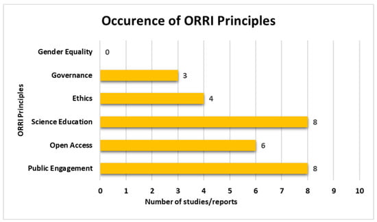 The findings were also categorized according to the six core principles of ORRI: public engagement, open access, gender equality, science education, ethics, and governance.