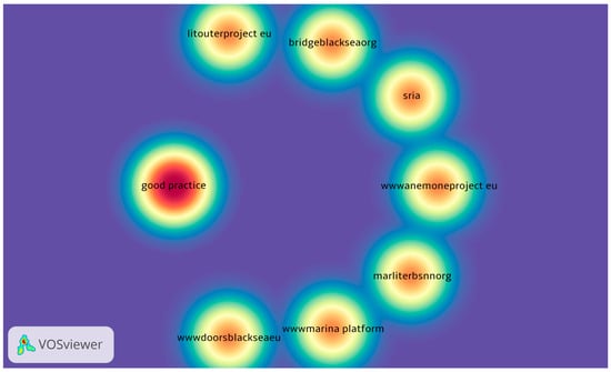 A co-occurrence network of keywords was generated using VOSviewer [34]. The software applies a natural language processing (NLP) algorithm to detect and cluster frequently occurring terms in the dataset. Nodes in the network represent keywords, while links between nodes indicate co-occurrence relationships. The thickness of the links reflects the strength of these connections. Additionally, a temporal overlay visualization was applied, where colors indicate the average year of occurrence for each term, ranging from 2014 (blue) to 2024 (red). A density visualization was generated using VOSviewer [34] to highlight the most frequently occurring terms and organizations. The heatmap represents the prominence of different entities, where red areas indicate high-frequency terms, transitioning through yellow and green to blue areas, which indicate lower frequency or relevance. Nodes represent key projects and initiatives, such as DOORS Black Sea, SRIA, and the ANEMONE Project, which are interconnected within the research landscape.